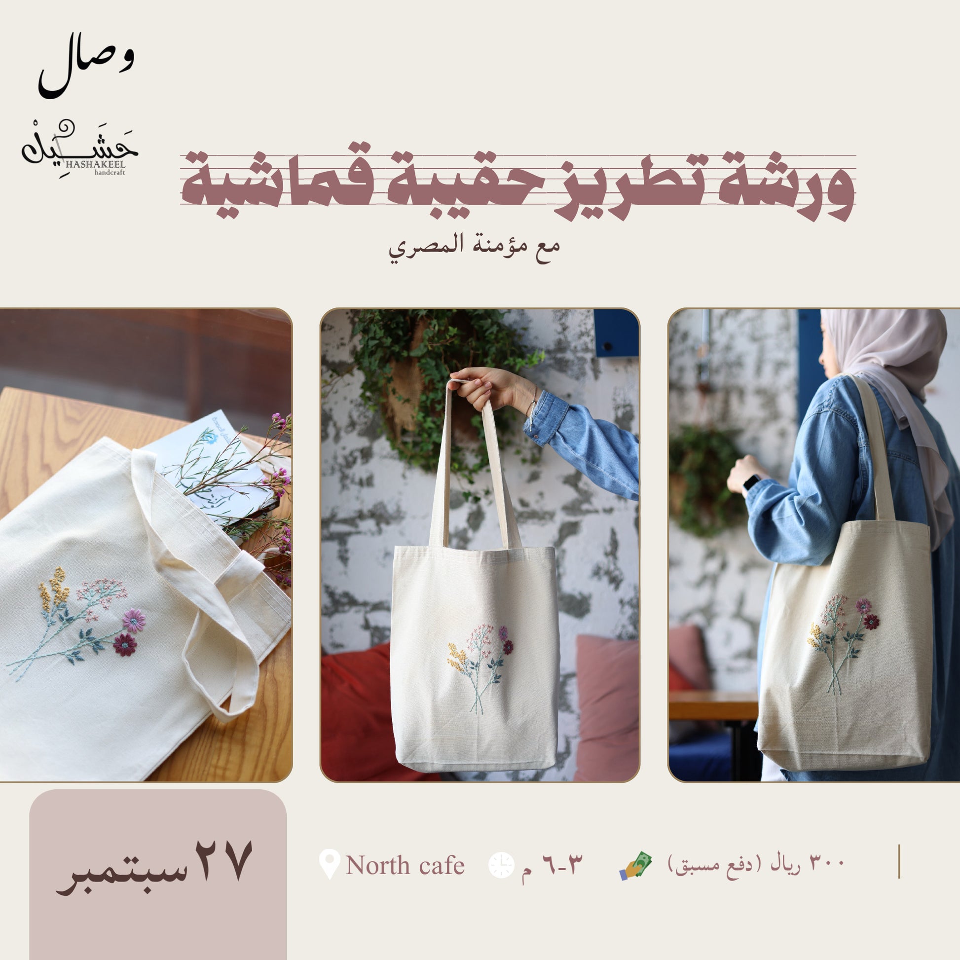 راح تحصلون على ١٥٪ خصم للقهوة في نورث كافيه و راح نوفر لكم جميع ادوات للتطريز و راح تكون الحقيبة لكم .
